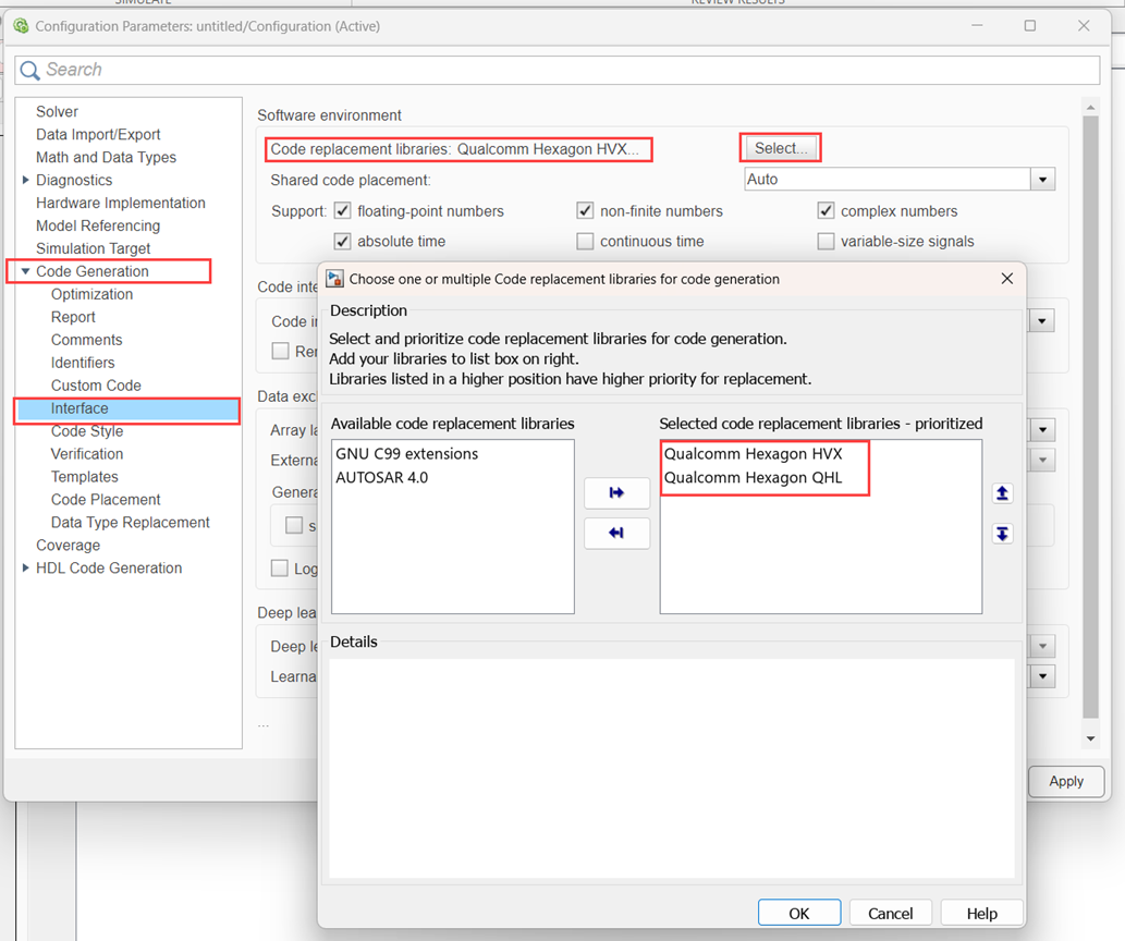 Open Configuration Parameters and navigate to Code Generation > Interface and set Code Replacement libraries to Qualcomm Hexagon QHL or Qualcomm Hexagon HVX or both.