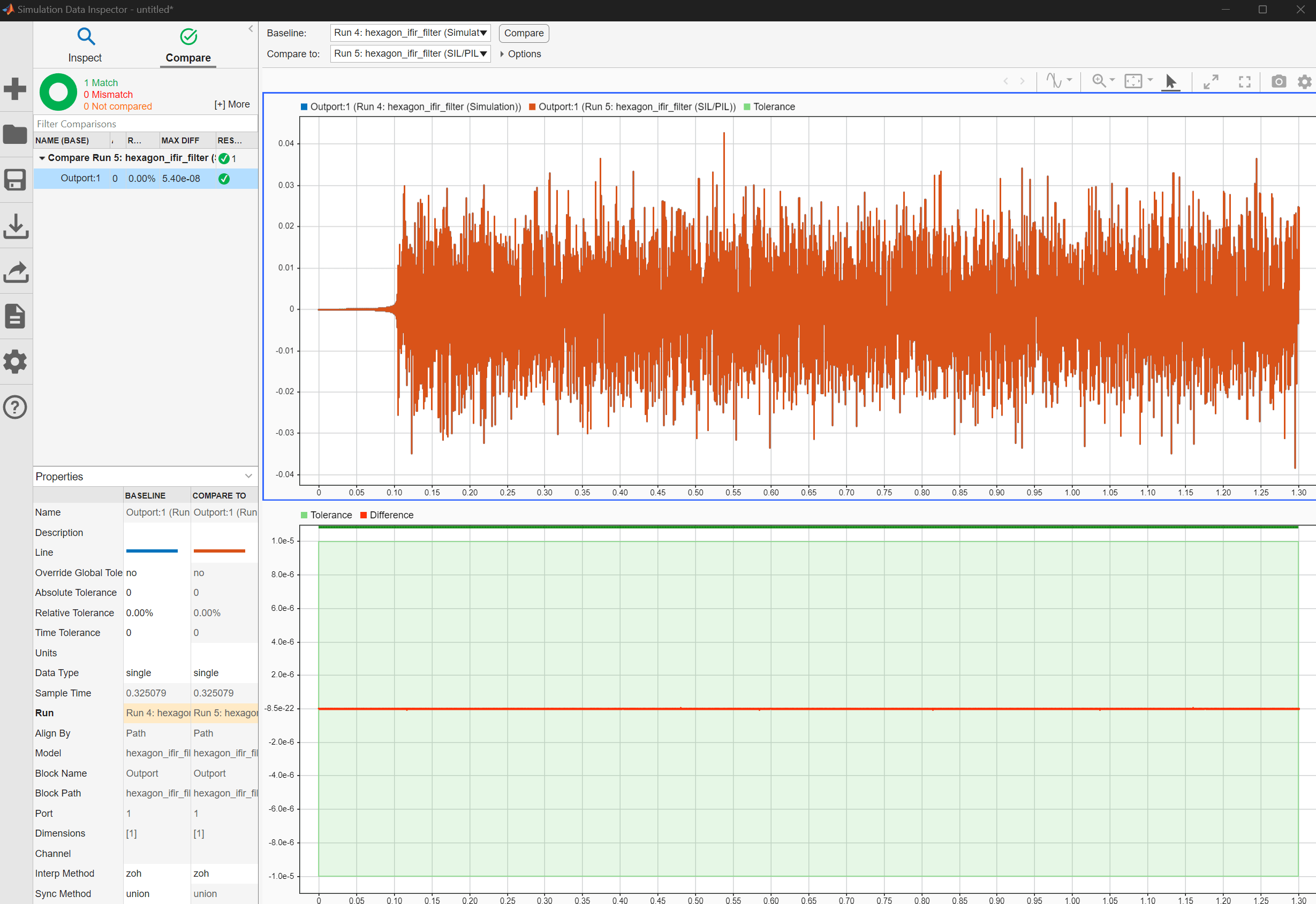 From the plot, observe that the simulation output overlaps with the PIL output (subplot-1), and the absolute sample tolerance is less than 1e-5 (subplot-2).