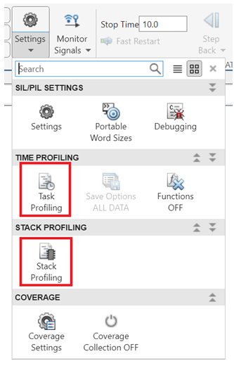 5. Select the appropriate options in the SIL/PIL Manager to enable execution-time metrics or stack profiling, in addition to numerical equivalence. Note that Task profiling and Stack profiling are mutually exclusive, select only one profiling mode at a time. Selecting both options together can result in an error during SIL/PIL setup or execution.
