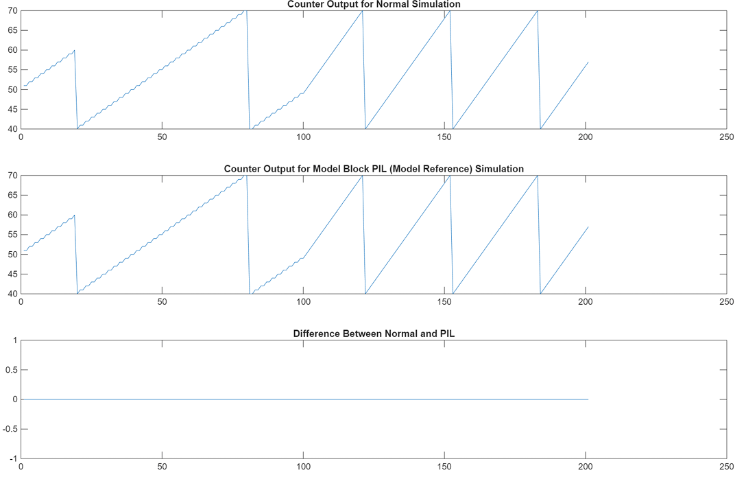 Observe that the reset signal forces the output to return to its lower limit of 40 at the 19th sample. Additionally, the difference signal highlights the numerical equivalence between the host simulation and the PIL simulation, allowing you to verify that both executions produce consistent results.