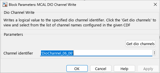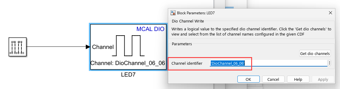 The MCAL DIO Channel Write block uses 'DioChannel_06_06', which is configured in the CDF, as the Channel identifier.