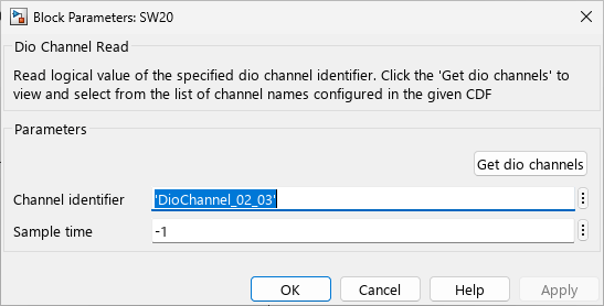Double click the Dio Channel Read block to open the block parameters dialog.