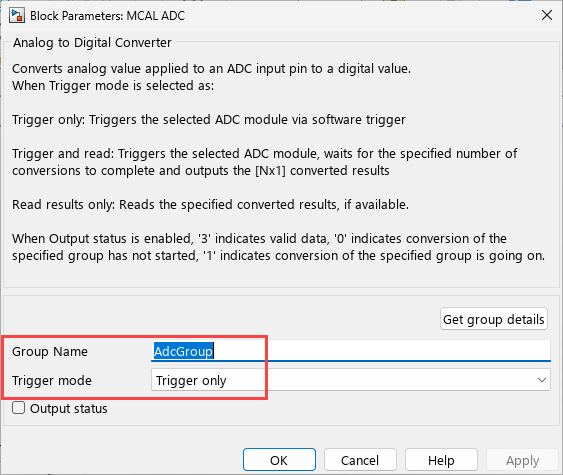 Double click the MCAL ADC block to open the block parameters dialog.