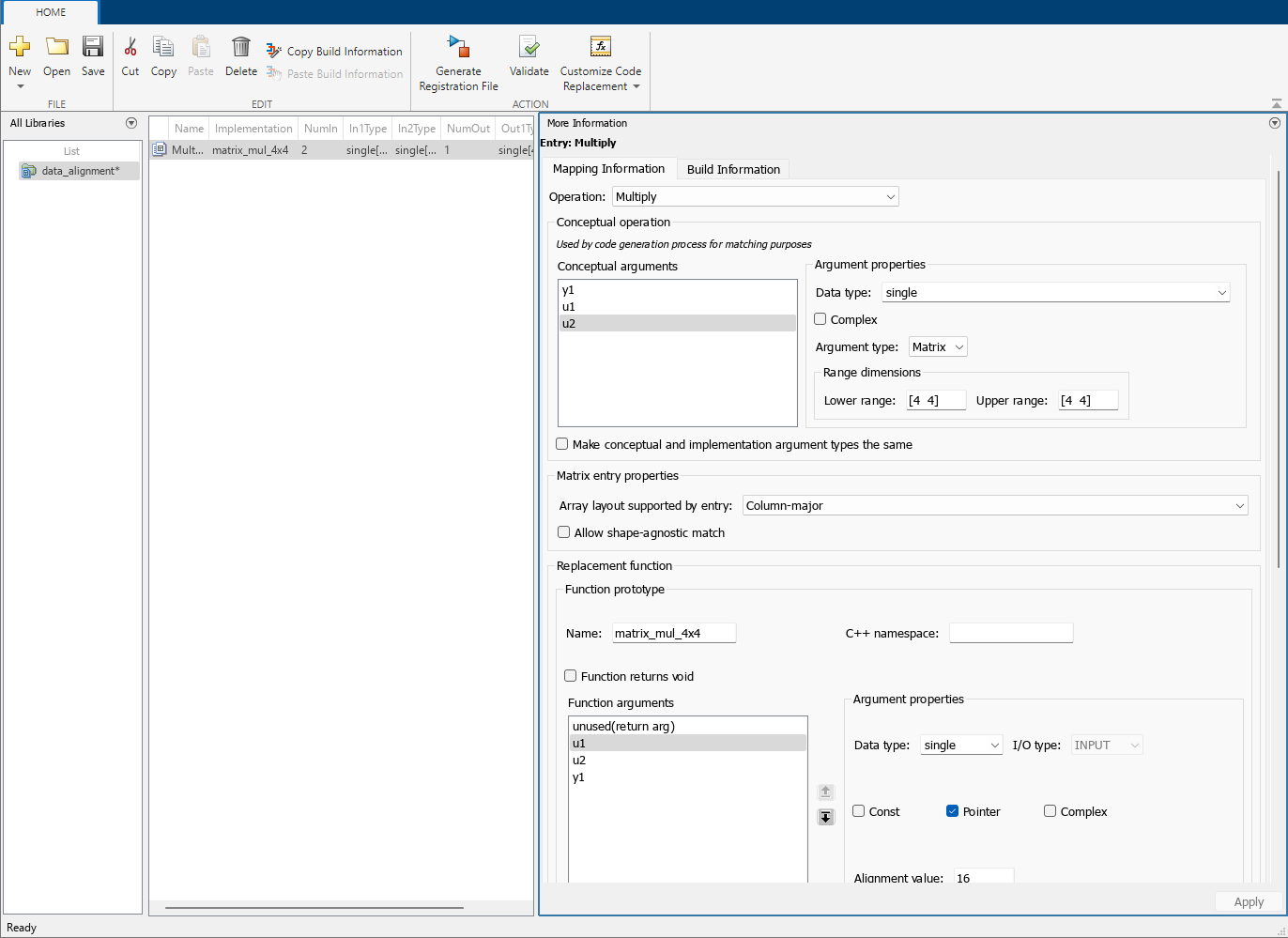 1. Specify the data alignment requirements in a code replacement entry. Specify alignment separately for each implementation function argument or collectively for all function arguments. See Specify Data Alignment Requirements for Function Arguments.