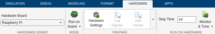 To run the model on a Raspberry Pi board, in Simulink Toolstrip, click Model Settings to open the Configuration Parameters dialog box. In the Hardware Implementation pane, set Hardware board to Raspberry Pi. Expand the Target hardware resources section and enter the Device Address, Username, and Password parameters for the board.