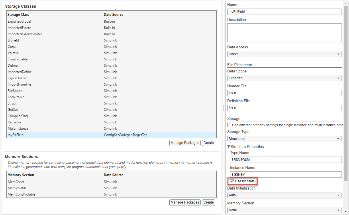 dict = coder.dictionary.create(model); SCSec = dict.getSection("StorageClasses"); SC = SCSec.addEntry("myBitField"); SC.set(StorageType="Structured"); SC.set(StructureBitFields=1);