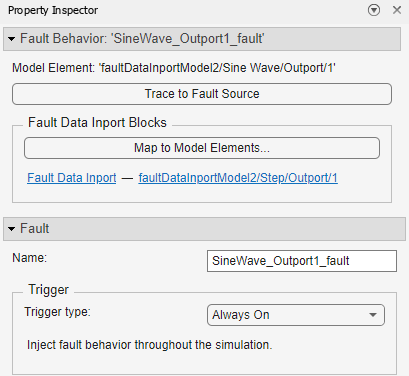 Double-click the Fault Data Inport block to open the Property Inspector. The Property Inspector lists the Fault Data Inport block name and the path of the model element in the Fault Data Inport Blocks section. In this example, the Fault Data Inport block retrieves the data from the output of the Step block.