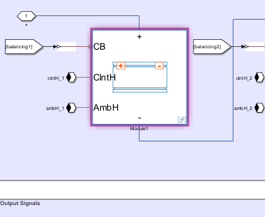 To model the battery pack, the BMS subsystem uses a Pack (Generated Block) (Simscape Battery) block named EV_BatteryPack. You add Pack (Generated Block) blocks interactively by using the Battery Builder (Simscape Battery) app, or generate the block programmatically by using the buildBattery (Simscape Battery) function. In this example, the pack includes two module assemblies, and each assembly includes four modules. For more information on how to build a battery pack, see Build Detailed Model of Battery Pack from Pouch Cells (Simscape Battery).