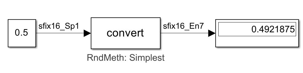 The result of the Data Type Conversion block calculation is, 0.4921875. Although the data type sfix16_En7 can represent the value 0.5 exactly, these calculations show how quantization can occur when you use a Data Type Conversion block. The principles of quantization also apply to calculations of fixed-point values in other Simulink blocks. To learn more about how to adjust settings in your Simulink model to improve accuracy of fixed-point values, see Resolve Unexpected Values from Data Type Conversion.
