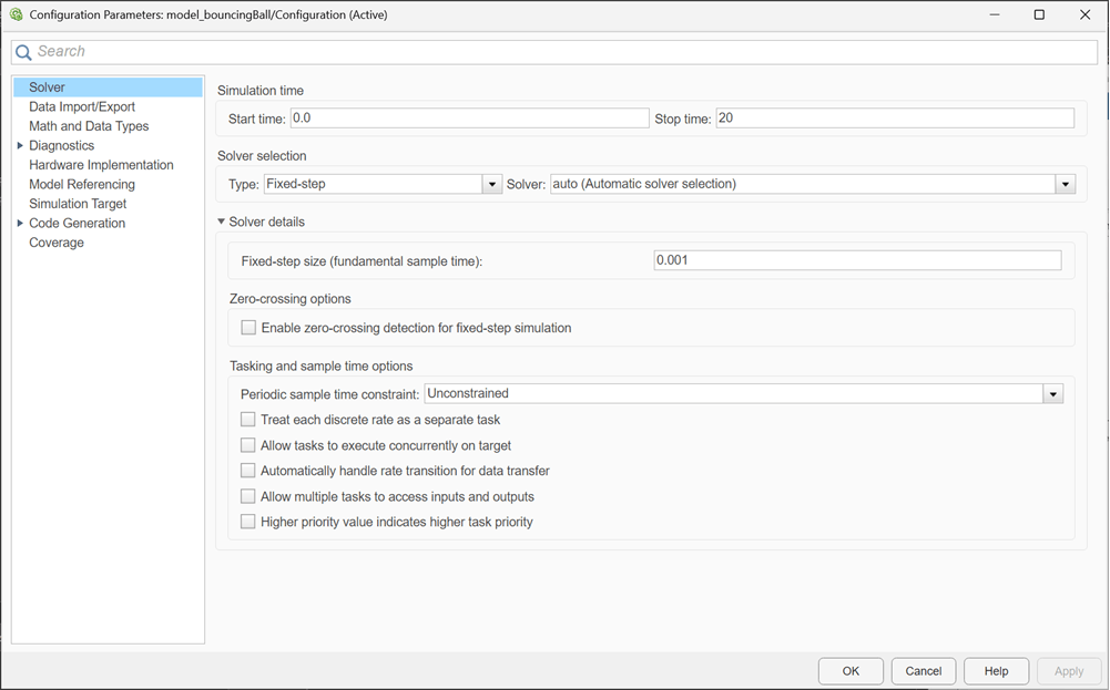 After configuring the input and output interfaces, specify the solver setting for the model that will be used by the Co-Simulation FMU. You can specify these settings in the Configuration Parameters dialog box. On the Simulink Toolstrip select the Modeling tab and click on Model Settings button in the Setup section. You can also open the dialog using the Ctrl + E keyboard shortcut. In the Solver pane, specify Solver and Type for your model. For this example, the Solver is set as auto and Type is specified as Fixed-step. For a fixed-step solver, you must also specify the Fixed-step size.