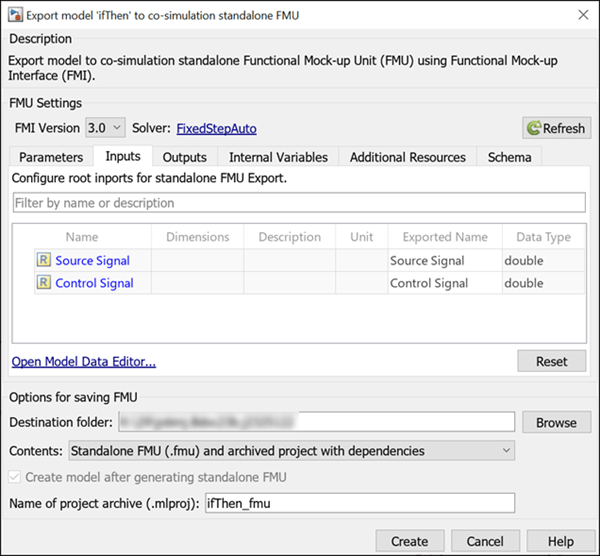 Click Create to export to FMU. You need a Simulink Compiler™ license and installation of the FMU Builder for Simulink support package for exporting Simulink models to an FMU. You can find the ifThen.fmu file in the location that you specified.