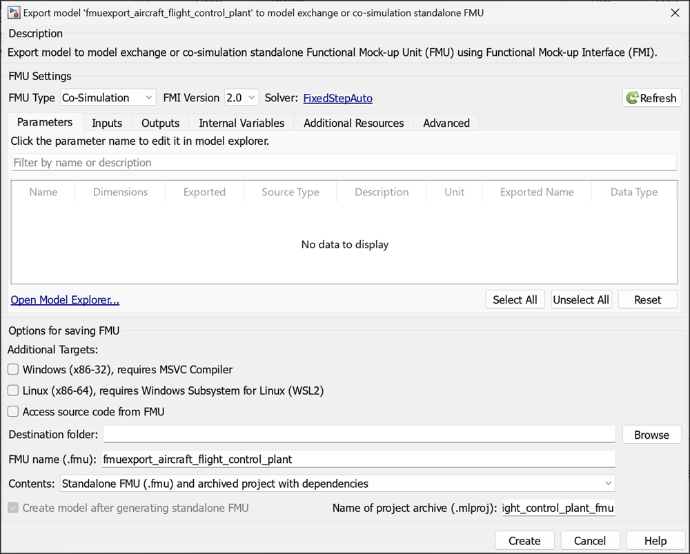 Click Create to export to FMU. The fmuexport_aircraft_flight_control_plant.fmu file can be found at specified save location.