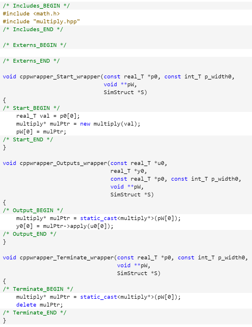 The following code implements a class multiply to be integrated into Simulink model. Class multiply takes a gain value in the constructor and multiplies it with an input value when the user calls member function double multiply::apply(double). The following implementation can be found in include/ and src/ directories.