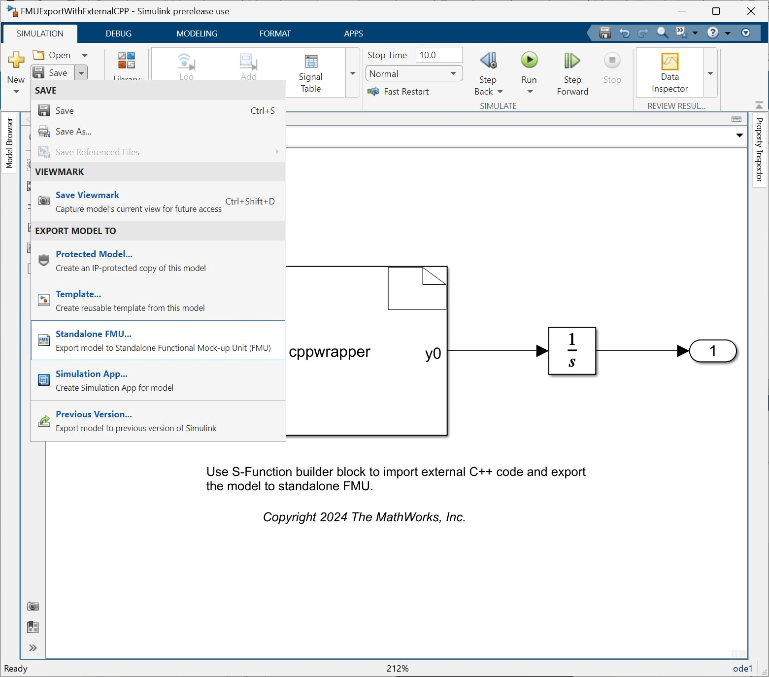 This example shows how to integrate external C++ code into a Simulink® model using S-Function Builder block and export the model to a standalone FMU. Your model can also contain other Simulink blocks which are supported for exporting to an FMU. S-Function Builder block lets user import C/C++ code into Simulink Semantic by building an S-function wrapper for external code. This example demonstrates this process in a phased approach by implementing a C++ multiply class, integrating C++ code with S-Function Builder, and exporting the model as a standalone FMU.