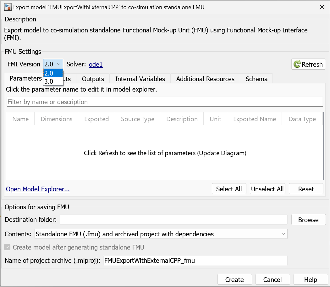 Use the exportToFMU function to export the Simulink model to Standalone Co-Simulation FMU. Set the FMI version by using the 'FMIVersion' Name-Value pair and the FMU type by using the 'FMUType' Name-Value pair. The values for 'FMIVersion' can be either '2.0' or '3.0'.