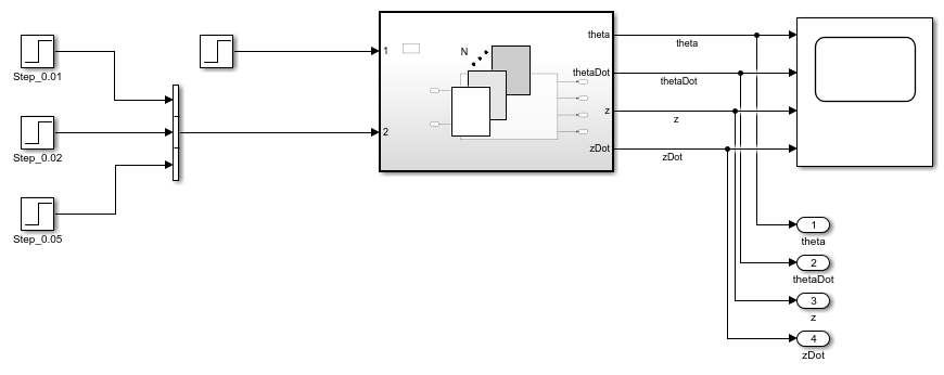 Open the suspensionModel_halfCar model. This is a simplified mathematical model of a vehicle's front and rear suspension system which can be used to study it's ride characteristics. The two inputs to this model are the pitch moment induced due to the vehicle's acceleration and the change in the road height that it travels on. For more information about this model, see Automotive Suspension.