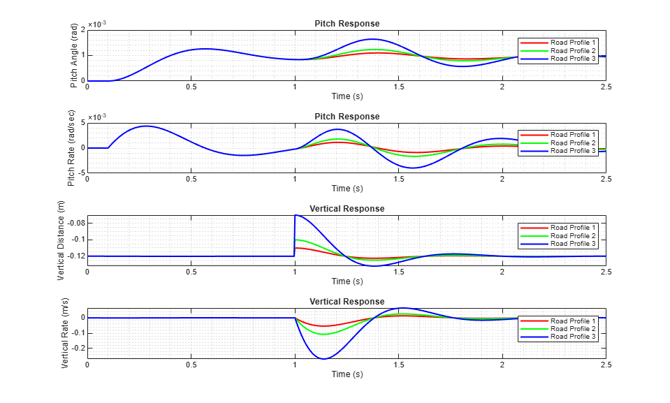 Simulate the model and observe the system response for the three different road profiles.