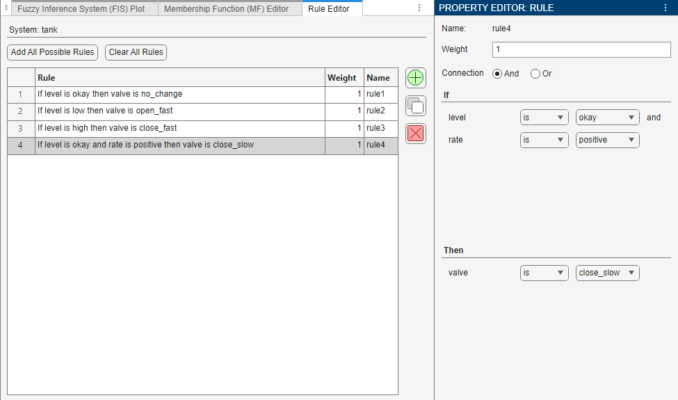 To modify the rule base, add rules using the Rule Editor document and specify the rule antecedents and consequents in the Property Editor. For more information on specifying rules, see Define Fuzzy Rules Using Fuzzy Logic Designer.