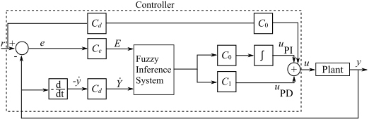 The fuzzy PID controller uses the change of the output -(y(k)-y(k-1)), instead of change of error e(k)-e(k-1), as the second input signal to the FIS. Doing so prevents the step change in reference signal from directly triggering the derivative action. The two gain blocks, Cd and C0, in the feedforward path from r to u, ensure that the error signal e is used in the proportional action when the fuzzy PID controller is linear.
