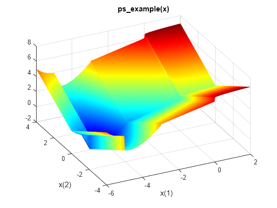 xi = linspace(-6,2,300); yi = linspace(-4,4,300); [X,Y] = meshgrid(xi,yi); Z = ps_example([X(:),Y(:)]); Z = reshape(Z,size(X)); surf(X,Y,Z,'MeshStyle','none') colormap 'jet' view(-26,43) xlabel('x(1)') ylabel('x(2)') title('ps\_example(x)')