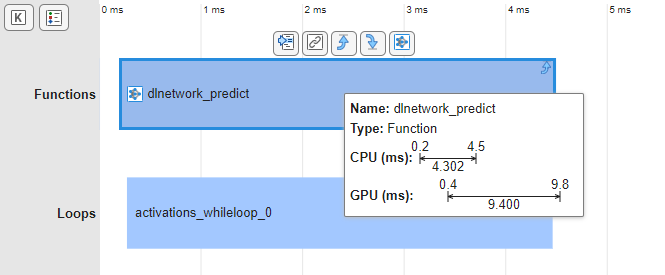You can identify performance bottlenecks in deep learning network code by using the Deep Learning Dashboard to analyze the runtime statistics of the network. The dashboard includes: