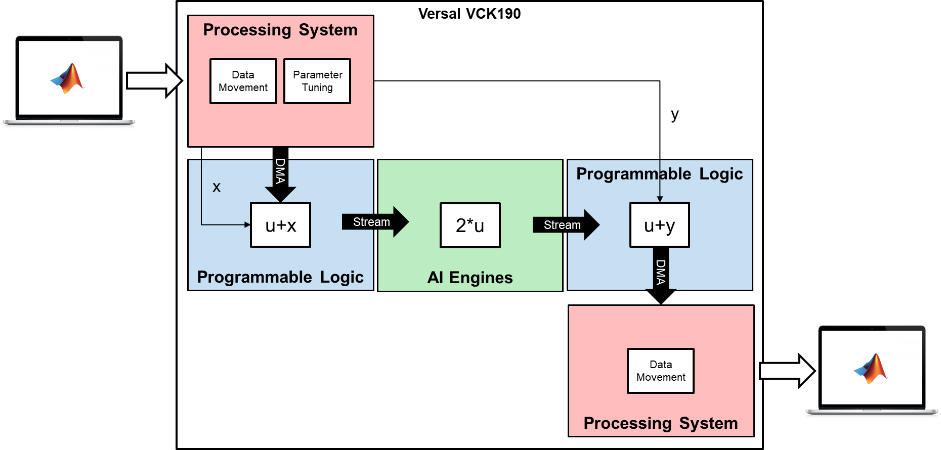 In this example, you deploy a heterogeneous system that connects the different computing domains of a Versal SoC device. You create a design where the programmable logic and AI Engines perform basic math operations, and the processing system is used for data movement and parameter tuning. Use the MATLAB host computer to prototype the design on the hardware.