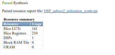 dsp_subsys2 implements the same operation by using bit widths that are larger than the DSP on a Xilinx FPGA. If you deploy this Subsystem onto a Xilinx Virtex 7 FPGA, you see that the entire design fits onto one DSP slice and uses additional slice logic.