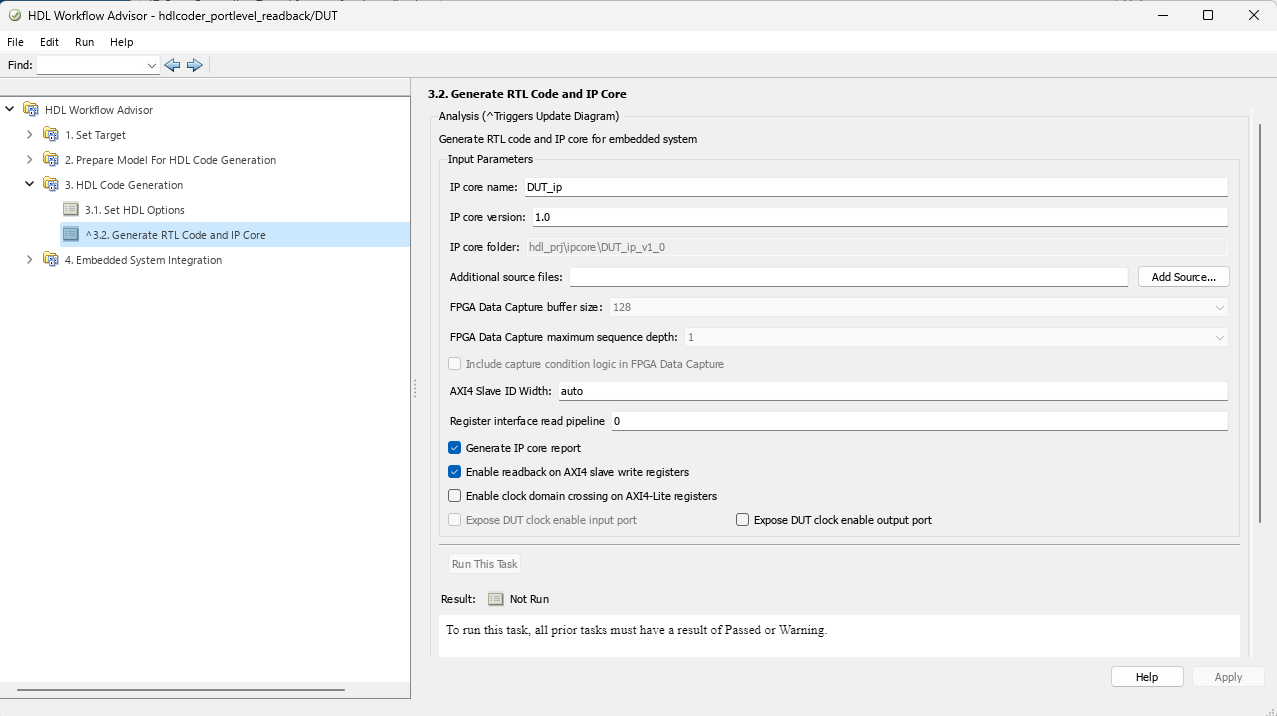 3. You can turn on the readback on AXI4 slave input registers by using the HDL workflow Advisor or by using the command-line interface. Generate RTL code and IP Core, by default, the readback on AXI4 slave input register is turned off. To enable this option, select Enable readback on AXI4 slave write registers under the Generate RTL Code and IP Core task of HDL Workflow Advisor.