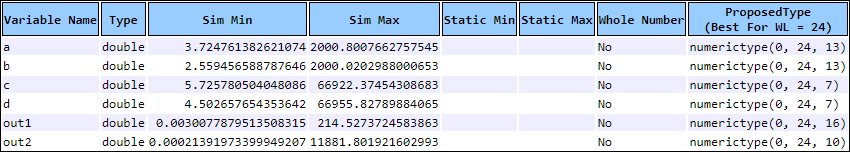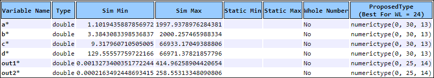 After making this modification, proposed fixed-point types in the Fixed-point conversion report appear as follows. Note that the customized fixed-point types are marked with asterisk.