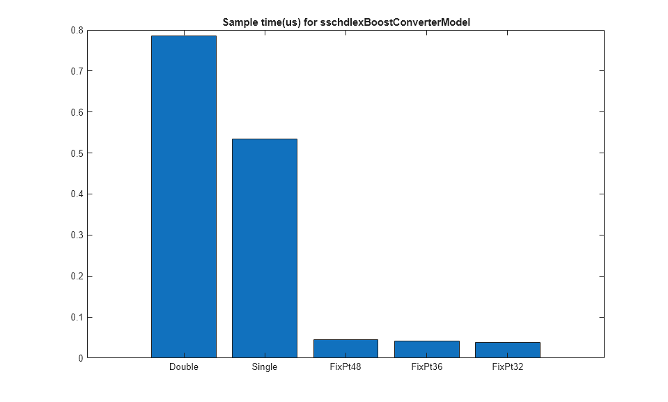 To compare the performance of the Boost Converter Model across different data type precisions, visualizing the sample time data is key. By plotting this data as a bar graph to observe how the sample time of the model varies with precision changes, use: