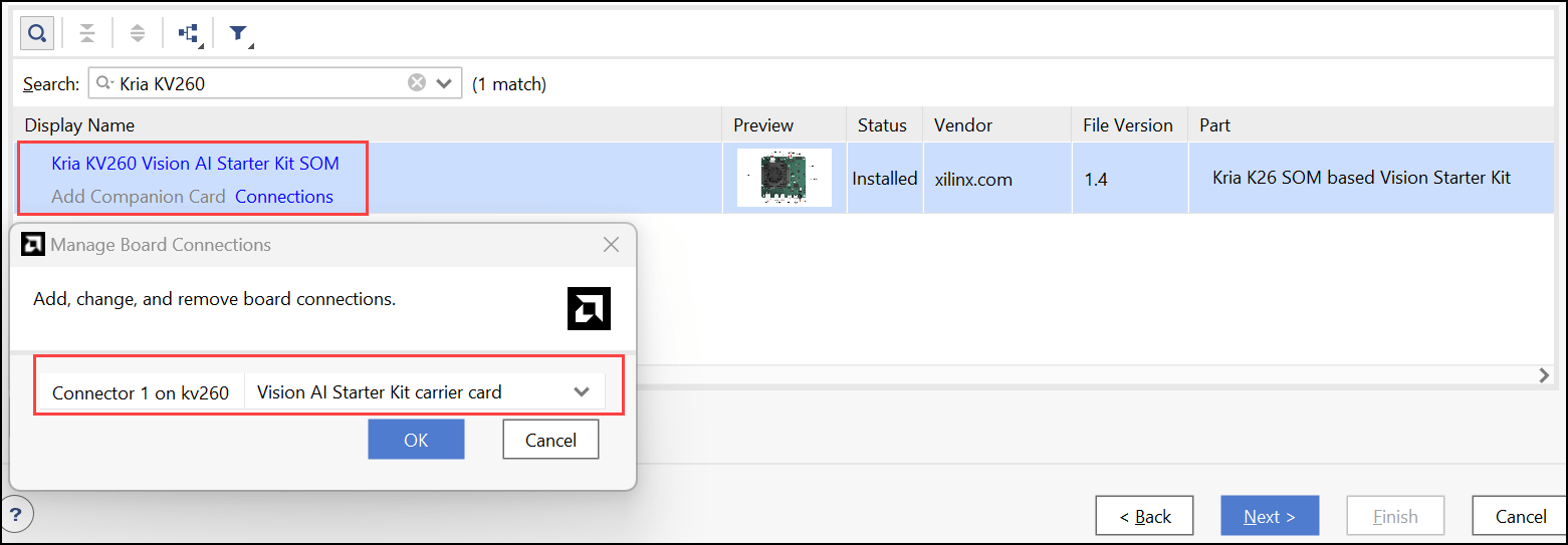 1. Open Xilinx Vivado and create an RTL project by adding the necessary source files and the constraint files. In the board selection step, click the Boards tab and select AMD Kria KV260 Vision AI Starter Kit SOM as the target device. If you want to add the companion card and manage the connections to the SOM, click the connections option as shown below.