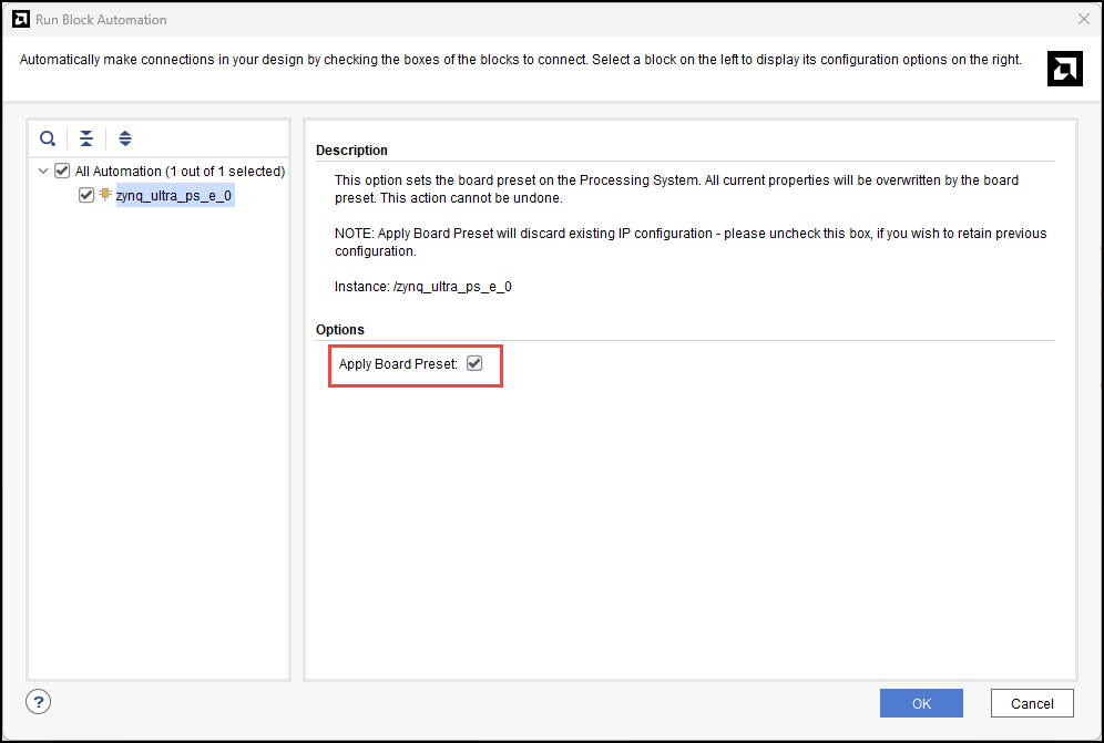 3. To set the board preset on the PS, select the Apply Board Preset check box. After applying the board preset, the block design marks the MIO peripherals according to the board definition.