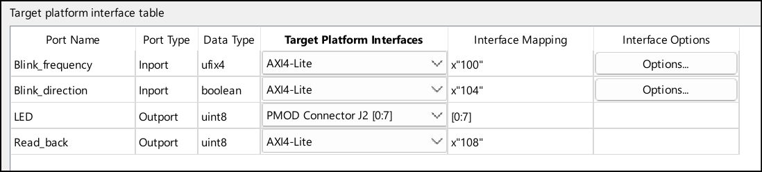 7. In Task 1.3 Set Target Interface, set the target platform interfaces for input and output ports. Set the Blink_frequency, Blink_direction, and Read_back ports to AXI4-Lite and LED port to PMOD Connector J2 [0:7] and then click Run This Task.