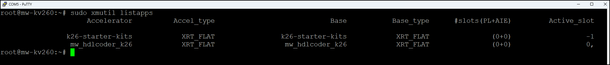 5. Initially, the board uses the factory-provided BIN file to boot up. After the board boots, run this command at Linux terminal of the board to load the provided MathWorks BOOT.BIN file. For more information on opening the Linux terminal on the target, see Command Line Session with AMD SoC Devices (Embedded Coder).