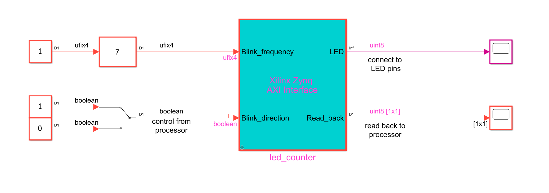 Open the generated software interface model gm_hdlcoder_led_blinking_interface_8bit.slx. Click Monitor & Tune and you can see the counter value in the scope connected to the Read_back port. For more information, see Get Started with IP Core Generation from Simulink Model.