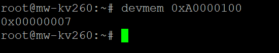 In the above model, the Blink_frequency is 7. You can verify this on the target by using the devmem command. The register address for Blink_frequency is 0xA0000100, which is the base address, 0xA0000000, combined with the address offset, 0x00000100. The base address is the value you defined for your HDL IP core in the plugin_rd.m file. The address offset is the address that HDL Coder assigns to this register in Interface Mapping tab. You can also view this information in the IP core generation report.