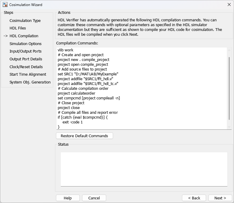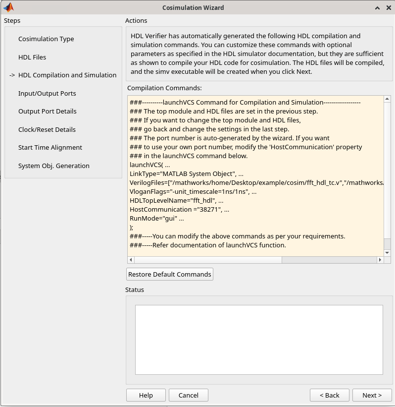 The Cosimulation Wizard takes the Verilog file as its input. It also collects other inputs pertaining to the HDL code for setting up cosimulation in each step. At the end of the example, the Cosimulation Wizard generates a MATLAB script that instantiates a configured HDL Cosimulation System object, a MATLAB script that compiles the HDL design, and a MATLAB script that launches the HDL simulator for cosimulation.