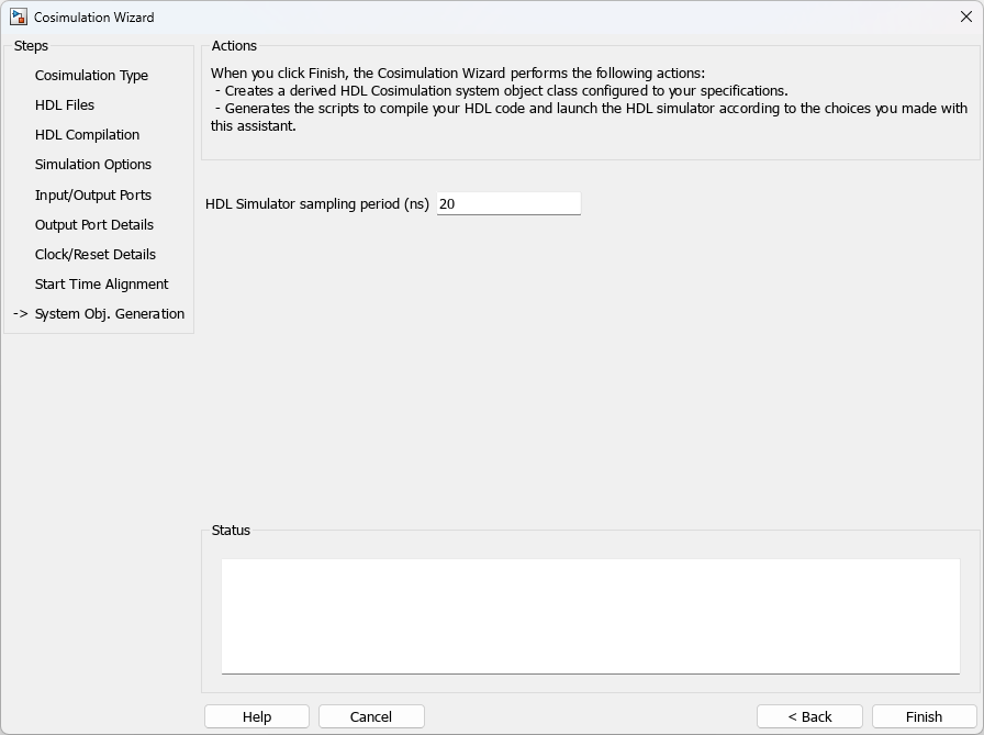 Before the Cosimulation Wizard generates the scripts, you have the option to modify the HDL Simulator sampling period. The sampling period determines the time in the HDL Simulator that elapses between each call to step in MATLAB. The sampling period is typically equal to the clock period. You can also specify if your inputs and outputs are frame based (instead of sample based).