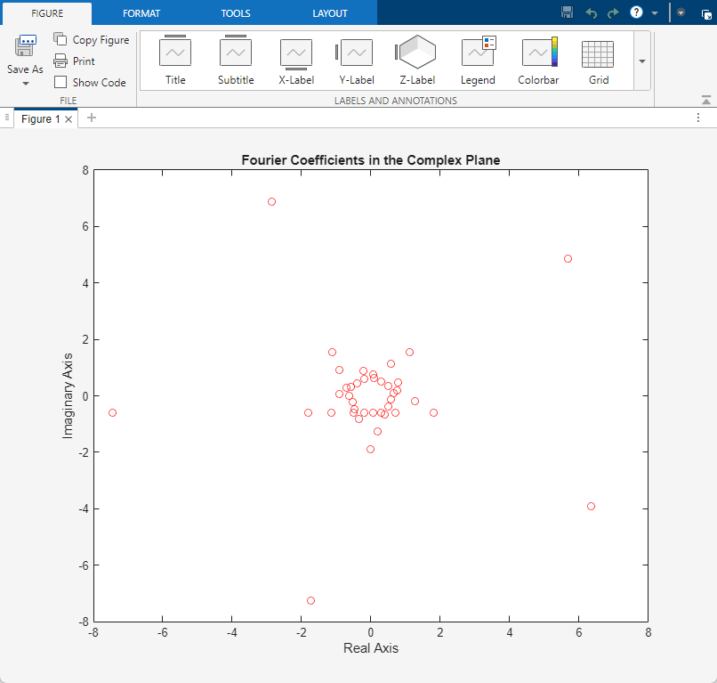 Verify the result from the plot in the testbench. The plot displays the Fourier coefficients in the complex plane.