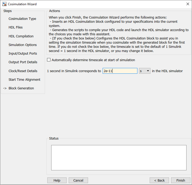 Before you generate the HDL Cosimulation block, you have the option to determine the timescale before you finish the Cosimulation Wizard. Alternately, you can instruct HDL Verifier to calculate a timescale later. Timescale calculation by the verification software occurs after you connect all the input/output ports of the generated HDL Cosimulation block and start simulation.