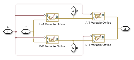 The block is a composite component with four Variable Orifice blocks driven by a single physical signal. Blocks Variable Orifice P-A and Variable Orifice P-B represent the P-A and P-B flow paths. Blocks Variable orifice A-T and Variable orifice B-T represent the A-T and B-T flow paths. The physical signal is specified through Connection Port block S.