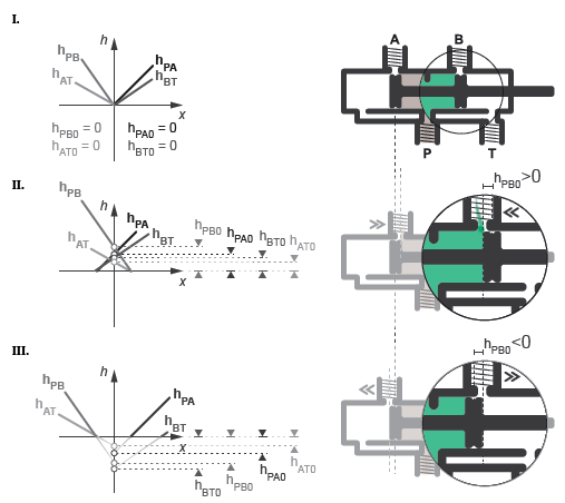 The figure shows the effects of the opening offsets on the orifice openings. Plot I corresponds to the default configuration with both opening offsets equal to zero. Plot II corresponds to a valve with both opening offsets greater than zero and plot III to a valve with both opening offsets smaller than zero. These cases are similar in behavior to zero-lapped (I), underlapped (II) and overlapped (III) valves. The valve schematics to the right show what the offset might look like. The circle highlights the offset in path P-B.