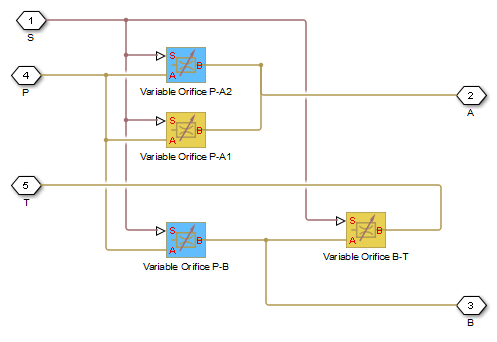 All Variable Orifice blocks are controlled by the same position signal, provided through the physical signal port S, but the Orifice orientation parameter in the block instances is set in such a way that positive signal at port S opens the orifices colored blue in the block diagram (orifices P-A2 and P-B ) and closes the orifices colored yellow (orifices P-A1 and B-T). As a result, the openings of the orifices are computed as follows: