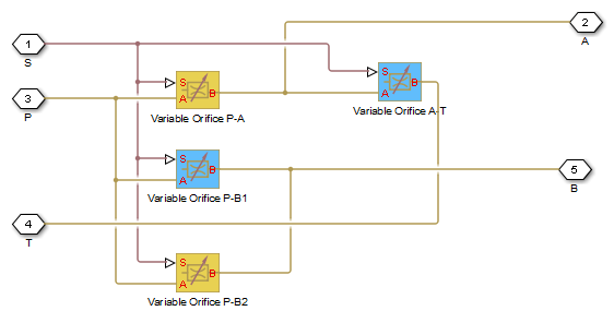All Variable Orifice blocks are controlled by the same position signal, provided through the physical signal port S, but the Orifice orientation parameter in the block instances is set in such a way that positive signal at port S opens the orifices colored blue in the block diagram (orifices P-B1 and A-T ) and closes the orifices colored yellow (orifices P-A and P-B2). As a result, the openings of the orifices are computed as follows: