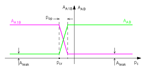 The relationship between the A-B, A1–B path openings and control pressure pc is shown in the following illustration.