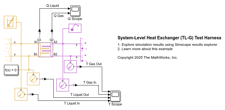 The System-Level Heat Exchanger (TL-G) block models a heat exchanger based on performance data between a thermal liquid and a gas network.