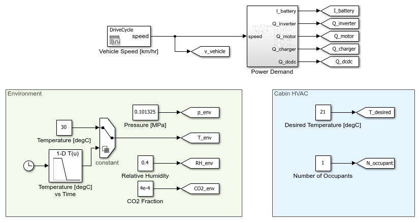 This subsystem sets up the environment conditions and inputs to the system for the selected scenario. The battery current demand and power electronics heat load are a function of the vehicle speed based on tabulated data.