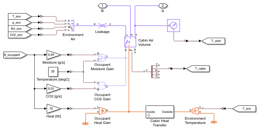 The vehicle cabin is modeled as a large volume of moist air. Each occupant in the vehicle is a source of heat, moisture, and CO2.