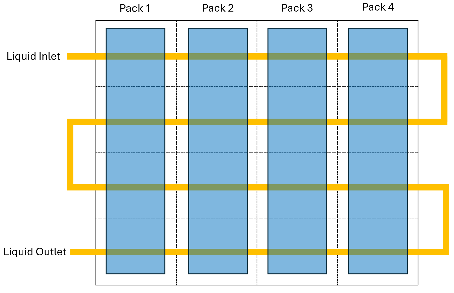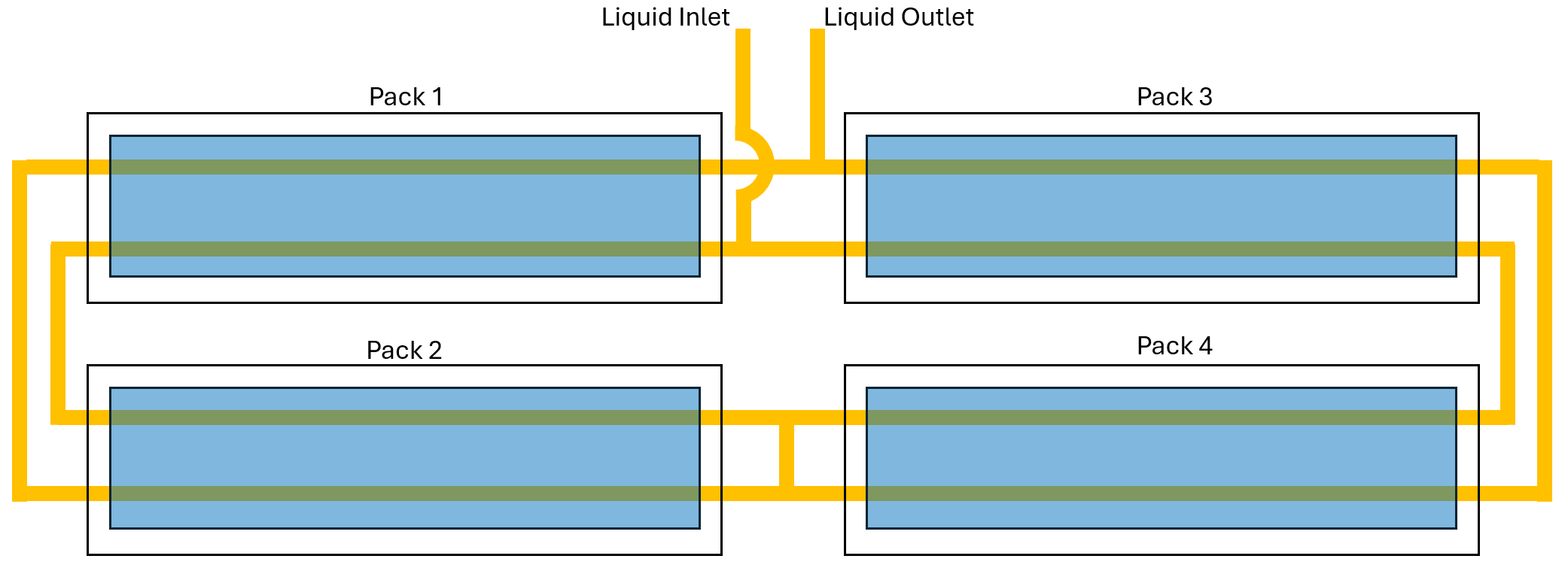 There are two possible variants for the cold plate: Individual plates and an integrated plate. The individual plates variant consists of four individual cooling plates that each interface with a battery pack. Each cooling plate has thermal liquid channels through which the corresponding battery pack dumps or absorbs heat. In this schematic, a blue rectangle represents a battery pack, and a white background rectangle is a cooling plate. Yellow lines denote liquid channels.