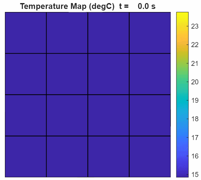 The integrated plate variant represents a single large cooling plate on which all the battery packs rest. As shown in this schematic, the plate is discretized using sixteen custom plate elements. For advanced modeling of cooling plates, see Connect Cooling Plate to Battery Blocks (Simscape Battery).